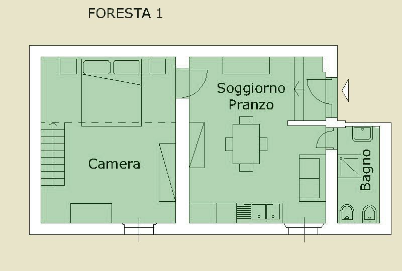 Rez-de-chaussée : salon-salle à manger avec coin cuisine. Chambre double avec mezzanine. Salle de bain avec douche. Espace extérieur avec table, chaises, parasol et barbecue.