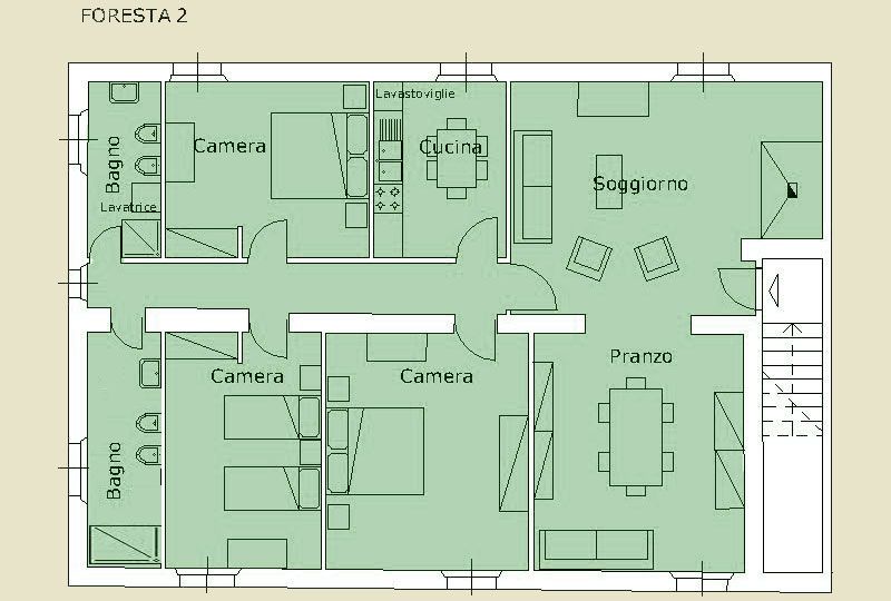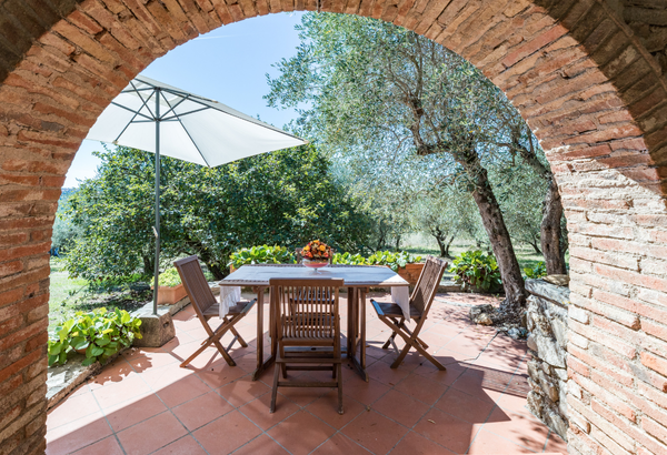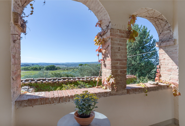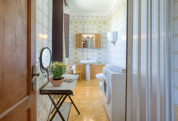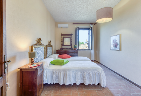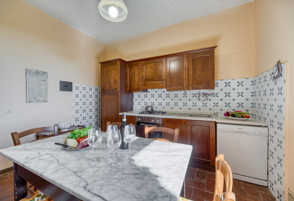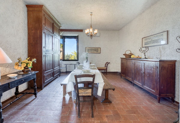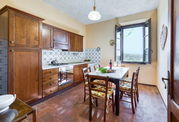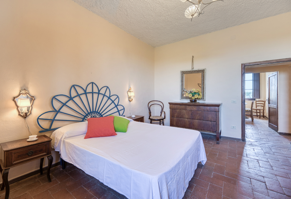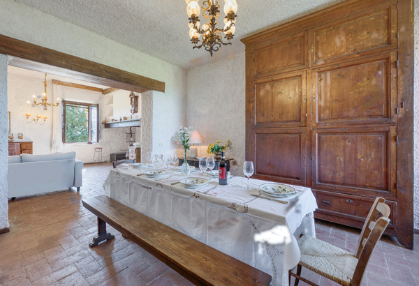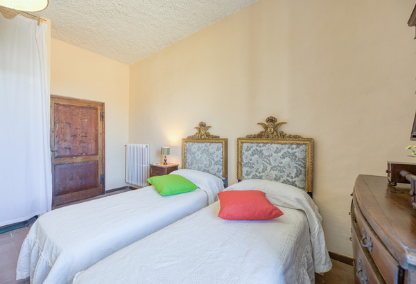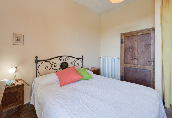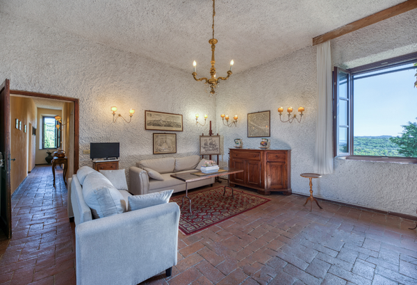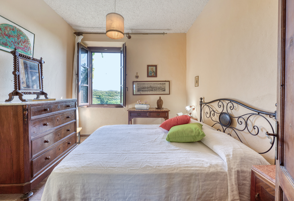 Premier étage : grand salon-salle à manger avec cheminée, cuisine, 2 chambres doubles et une avec lits jumeaux, 2 salles de bains spacieuses avec douche, loggia extérieure au rez-de-chaussée avec table, chaises, parasol et barbecue en maçonnerie. Un escalier extérieur mène à la loggia, très suggestive, avec deux arches, d'où l'on peut admirer un magnifique panorama. Elle peut accueillir jusqu'à 6 personnes.